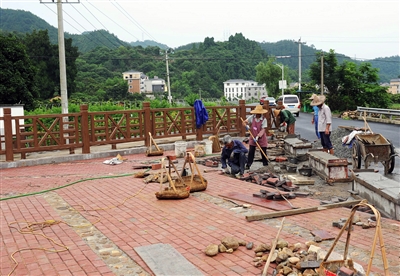 6月28日,在千岛湖镇茂畈村文化广场建设工地现场,施工人员正在利用雨后的凉爽天气抢抓工期,力争让村民企盼的休闲娱乐广场早日投入使用。近年来茂畈村农村基础设施和村容村貌逐步完善,墙体美化、景观公园、停车场等相继完工投入使用,农居点建设也即将完工,美好的新农村新景象为村民带来了全新的品质生活。