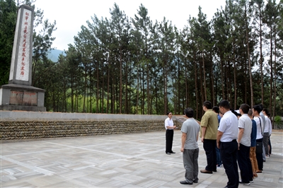 图1:6月24日,县机关党工委组织预备党员在白马烈士纪念碑下,听当地人讲述当年红军的故事。