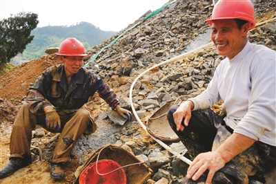朱根二双手握住摇柄小心翼翼地将哥哥朱根大送到十几米的井洞下,然后又将一桶桶泥沙摇上来。由于井小、狹窄、潮湿,打到10多米深时地下水的渗透量大,这天天气很热,三十分钟后,54岁的朱根大在井底感觉有点缺氧,就吊着那根细小的钢丝绳出了井口。潮湿和泥沙沾满了一身,看见有相机在井口等着他,朱根大显得有些拘束,连连说“别拍我,这样子太难看了……”当我说“劳动者是最美的,实在太棒了”时,他那布满泥沙的脸上才露出灿烂的笑容,端起弟弟送来的大瓶水咕咚咕咚喝了起来。他们是工地上唯一一对兄弟打桩工。“我们每天只能打三四米,遇到难打的也就一米多……”朱根大告诉记者。