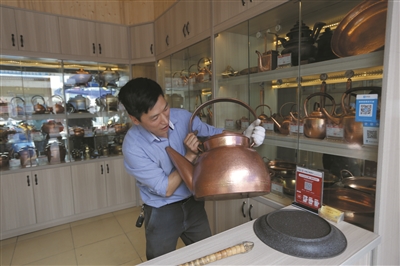 5月10日,记者走进景秀花园一家10平方米的蒋记铜艺店,柜面上摆放着各种已做好的铜壶、铜火锅、铜烛台、铜面盆……看上去很有光泽,分量颇重。这些小时候经常看到的传统家什已经离我们渐行渐远了。