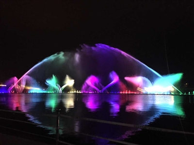 音乐奏响,五颜六色的水柱在优美的旋律中“翩翩起舞”,时而轻摇慢舞,时而欢快激昂,水柱与灯光交相辉映,互相碰撞,构成一幅幅美妙的图案。一出方歇,大大小小的水珠落下来,打在湖面上哗哗作响,仿佛为自己壮丽的表演而作谢幕鼓掌!