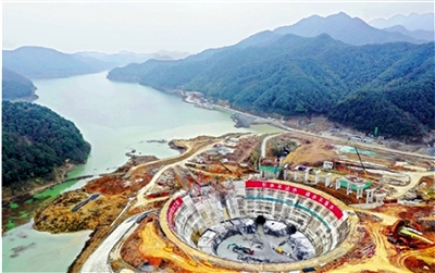 1月6日,从空中俯瞰杭州闲林水库,千岛湖配水工程的配水井已具雏形。这个“超级碗”可以蓄水约20万立方米,千岛湖湖水将通过输水隧洞进入这个碗状的配水井,再分别向杭州城区多个方向输水。目前,千岛湖配水工程已实现全线洞通,按计划,2019年将确保隧洞通水和杭州主城区基本通水。