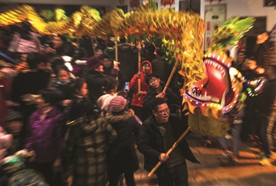 看大戏、舞长龙,欢天喜地闹元宵。2月19日18时,左口乡瑶村的40位青壮年,从文化礼堂“请”出了两条30多米长的红、黄彩龙,沿全村行走一周,为全村百姓祈福。据该乡负责人介绍,春节期间,全乡的每个村都有丰富多彩的文化活动,村春晚、跳竹马、舞龙灯、猜迷灯、看大戏等文化民俗活动贯穿整个正月。记者 汪黎明 摄