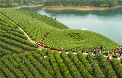 近日,春光明媚,在里商乡村坑村最美茶园大拇指岛上,来自里商乡的百名党员齐聚于此,参加“学党史颂党恩跟党走,百名党员献礼建党100周年”活动。