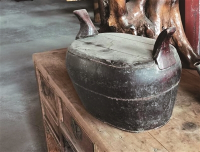 萱桶的形状就如一只小船,两只小角高高翘起,翘起的地方既可当把手用,又可在那个位置落锁。萱桶更像一只金元宝,中间宽,两头窄,呈有规则的椭圆形,也许当初就是根据金元宝的形状设计的。
