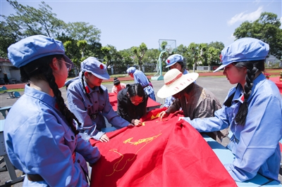 4月29日,淳安县浪川乡初级中学操场上,八名浪川乡军人家属化身“绣娘”,围绕“听党话、感党恩、跟党走”主题,通过一针一线绣制党旗、国旗,用朴实的方式表达对党的崇敬和爱戴之情,为建党百年献礼。