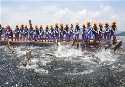 近年来,杭州千岛湖发展集团有限公司每年都要向千岛湖投放1000余万尾的链鳙鱼种,利用其滤食水中浮游动植物的习性,并通过严格限量捕捞,在实践中找到了一条以鱼护水、以水养鱼、以鱼富民的生态可持续发展之路。图为7月30日,千岛湖上演巨网捕鱼的壮景,一网收获了6万公斤有机鱼,呈现一派鱼跃人欢的丰收景象。