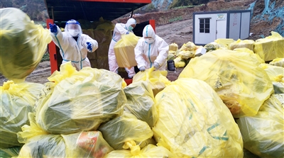 截至目前,隔离医学点当日产生的涉疫危险生活垃圾都已做好了集中清运,并按照防疫规定对其进行处理。据介绍,应急清运小组成员都是环卫工作经验丰富的“老将”,一身橙衣的他们穿上了严密的防护服,前往隔离医学点将涉疫垃圾进行集中清运,严格把好涉疫危险生活垃圾处置的各个关卡,全力打赢这场疫情防控阻击战。