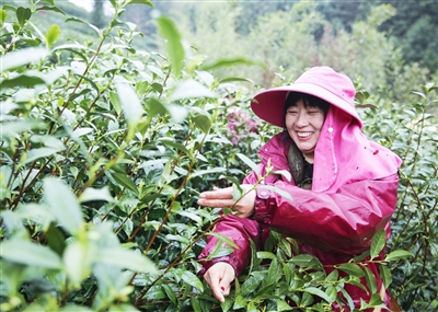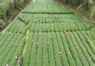 3月23日,在文昌镇的中茶龙冠“龙井43”良种茶基地,160多名采茶工忙着采摘龙冠龙井茶叶。