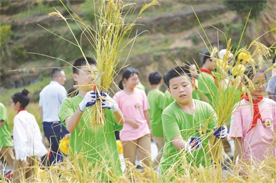 孩子们走进田间地头,在劳动体验和丰收喜悦中为祖国母亲献上祝福,用劳动的汗水和幸福的笑脸迎接党的二十大胜利召开。通讯员 叶子贵 孙灵燕 王捷