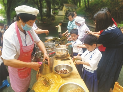 活动期间,大小互动,又唱又跳,到处洋溢着快乐和亲情。大人们在展开妙趣横生的“抓鸭子”赛和“排球大作战”的同时,还手把手教孩子们包粽子、编彩绳、缝香包等。活动最后部分是分享劳动成果。“这个好像是我包的。那个好像是我包的。”孩子们拍着手,大声嚷叫着,到处都是开心的笑声。大家一起品尝着美味的粽子,感受着端午节这一传统节日的饮食习俗。