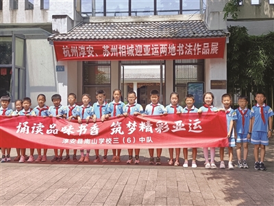 7月8日,县南山学校三(6)中队队员们来到千岛湖艺术馆,开展以“‘诵读品味书香 筑梦精彩亚运’——红领巾@亚运”为主题的活动。