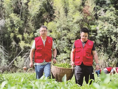 日前,在富文乡重坑村红花坞党建消薄基地,党外知识分子志愿者们正在忙着采摘、搬运辣椒,助力村集体增收。