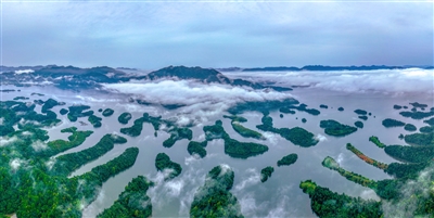 连日来,千岛湖持续高水位运行,雨后的东南湖区珍珠列岛碧波涟漪,云雾缭绕,构成一幅风光旖旎、生态秀美的壮丽画卷。