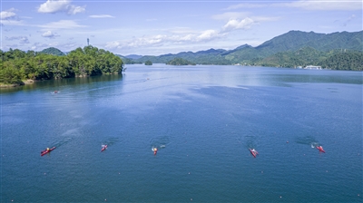 8点整,随着教练一声令下,5艘皮划艇犹如离弦之箭破浪疾行,运动员们奋力挥动着船桨,平静的湖面顿时水花四溅。烈日之下,碧波之上,一艘艘皮划艇劈波斩浪、你追我赶,上演着速度与激情,成为千岛湖上一道亮丽的风景。