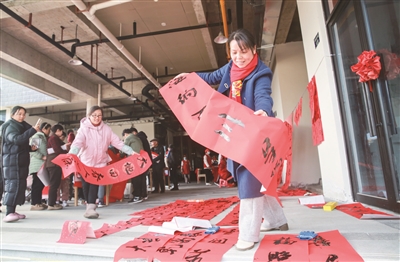 珍珠社区拟携手县文联、县青少年活动中心、县中医院、县消防救援局、悦民家庭综合服务中心开展“笔墨凝香贺新春 爱心服务暖万家”主题活动,为居民送上新春祝福。现场人头攒动、热闹非凡。来自县文联的书法爱好者和县青少年活动中心“小书法家”挥毫泼墨,一副副饱含新春祝福的春联和一张张寓意吉祥的“福”字跃然纸上。居民们纷纷围在桌前,帮忙将写好的春联和“福”字铺在地上晾干,一时间,现场满目红彤彤的春联和墨香四溢的“福”字,节日氛围感拉满。