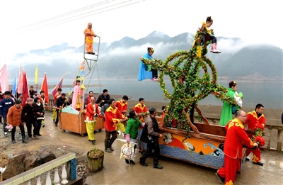 大墅“赶十八”是淳安县非物质文化遗产代表性项目。赶十八是大墅镇儒洪村特有的传统民俗节,至今已有六百余年历史。正月十八是余炳的诞辰日,余炳曾任严州知府,任期间遇到连年干旱,地裂草枯,百姓生活困苦。余炳心急如焚,亲自到道场求雨,并在烈日下跪拜三天三夜,最终被晒死。他的虔诚感动了天帝,连降三天三夜的大雨,缓解了当地的旱情。儒洪村祖辈为纪念他舍己为民的精神,便把正月十五元宵节改至正月十八闹元宵。每年正月十八,村里都要举行隆重的祭拜仪式,后这一仪式逐渐演变成热闹的庙会。从正月十七到正月十九,连续三天三夜唱大戏、舞龙灯、吃流水席,亲朋好友也从各地赶来汇聚儒洪。如今,这一文化特色,成为助推乡村旅游的一大亮点。