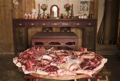 要想成功地制成上好的风干肉,放血也是重要的一关,技术不熟练的师傅,慌乱之中往往会乱了手脚,血放不干净,便会凝在肉里,肉便因此成了红色,不宜保存,因此也不宜制风干肉。褪毛的时间也不能太久,长时间泡在热水里的肉也是不宜储存的,一只猪的屠宰过程,从开始到结束,一般个把小时就差不多了,那些翻猪肠、剁猪肉的活可以慢慢来,因为无关乎风干肉的质量。