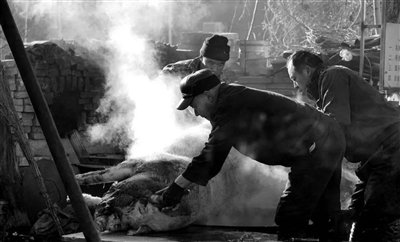 南方的气候,四季分明,冬至一到,“数九”来了,气温便越来越低了,村前的池塘里也结起了薄冰。午后的霜风一刮,第二天早晨你再往田野一看,麦苗油菜苗、路边的草丛白茫茫的一片,像雪一样。到了这个季节,农家的年猪也肥了,这天寒地冻的日子正好是冬储鲜肉的好日子。于是,这段时间村里逐渐热闹起来,天还没亮,那些屠宰师傅便来到东家家里,看水烧得怎么样了,因为水是头等大事。