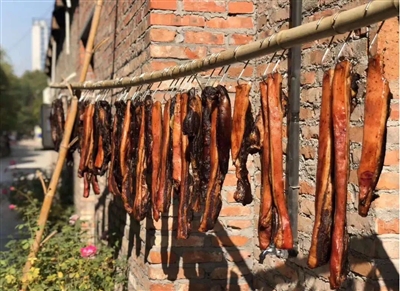 年关将至,家家户户的窗台上、院子里便挂上了一条条“条子肉”,等待着自然风干。