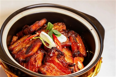 这时候,从搁板底挑一块下来,放在一尺八的大铁锅里,用水浸着,水烧开后把灶膛的的火灭掉,让风干肉在热水里浸泡一会儿,然后用竹筅帚把那些沟沟壑壑里的灰尘洗涮干净,切成二寸来长、三五分厚的块状,放入砂锅,不用添加过多的调料,只要加上水、米酒和食用盐便可。