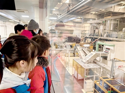 活动当天,同学们踏入厂房,便被眼前的景象深深吸引。在参观矿泉水生产流程时,他们目睹了千岛湖湖水从采集到历经八道精密过滤工序,再通过臭氧杀菌技术消毒,最终灌装成成品的全过程。现代化生产线上,机械臂以每分钟800瓶的速度精准完成取瓶、灌装、封盖等动作,让同学们惊叹不已。在瓶子生产区域,同学们见证了瓶坯在高温和吹塑模具作用下神奇地变成矿泉水瓶的过程,对现代科技在工业生产中的应用有了更直观的认识。