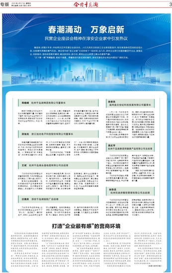 编者按:时隔6年多,中央再次召开民营企业座谈会。人们尤其关注的浙江企业家的脸庞中,有在商海身经百战的自信从容,也有青年弄潮的意气风发。舆论场中的“浙江浓度”已经持续了一段时间,这几天,淳安企业家们也围绕着坚守主业、做强实业、创新驱动、绿色转型等关键词,畅谈新目标、新行动,展现出企业家勇立潮头的蓬勃气象。