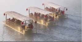 游客乘坐“竹筏”造型的电动游船在建德新安江上缥缈的江雾中前行,感受穿越仙境般的清凉之旅。