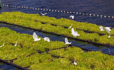 近日,千岛湖生态浮岛上,成群的灰鹭、白鹭等水鸟,或翱翔于天空,或觅食嬉戏于水中,呈现一幅和谐美丽的生态画卷。记者 杨波