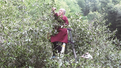 走进富文乡雪坑源,陡峭的溪流两岸生长着近两米高的古茶树,手臂粗的枝干虬曲苍劲。茶农们腰挎竹篓爬上梯子,一手压弯枝条,一手手指在翠绿茶丛间翻飞如蝶,嫩绿的茶芽簌簌落入篓中。