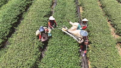 近日,枫树岭镇汪村村有机茶园内,茶农们正在进行机械化采摘茶叶。近年来,枫树岭镇依托良好生态大力发展茶叶产业,并通过土地流转、政策扶持的方式引进现代农业企业,提升机械化水平,有效提高当地群众收入。通讯员 汪建林