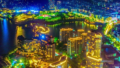 初夏,俯瞰千岛湖镇,灯火璀璨的城市轮廓与波光粼粼的湖面相映成趣,尽显都市风情。市民游客徜徉其间,共赏山城璀璨夜景的独特魅力。