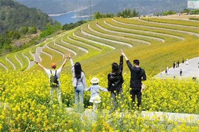 当绚丽多彩的油菜花,顺着层层叠叠的梯田,像瀑布一样从山顶倾泻而下,千岛湖的长岭上瞬间成了江南春日最美的画卷。