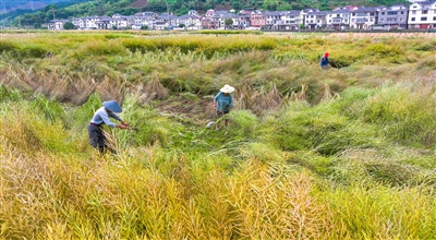 眼下正值油菜丰收时节,连续的阴雨天气中,大墅镇栗月坪村的农户抢抓晴好间隙收割油菜,并同步推进水稻种植筹备工作,全力确保夏收颗粒归仓、夏种不误农时。 记者 杨波