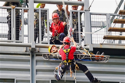 在杭州戎耀拓斯应急保障中心实训基地,参训学员身着专业装备,紧密配合开展实战演练。只见参训学员利用绳索技术将模拟伤员从高处平稳转移至安全区域,地面组迅速实施医疗救护,全过程精准有序。“此次培训贴近实战,设置了四大救援科目,有效提升了我们在真实条件下开展应急救援的技能水平。”参训学员陈鲁男说。