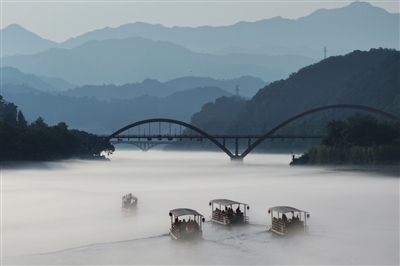进入浙江淳安、建德境内,新安江又展现出另一种风姿。1960年4月,新安江水电站正式投产,“高峡出平湖”,造就了享誉世界的千岛湖。万顷碧波之上,1078座岛屿星罗棋布,构成了独一无二的“天下第一秀水”景观。