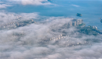 清晨,千岛湖镇被层层云雾包裹,云海漫卷间,青山、湖面与岛屿若隐若现,勾勒出生态与城市共生的美好图景。